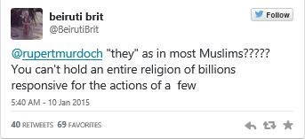 کاربر دیگری نیز به مرداک اعتراض میکند که چرا رفتار تعداد محدودی از مسلمانان را به همه آنها نسبت میدهد و میگوید: تو نمیتوانی همه طرفداران میلیاردی یک دین را برای اقدام تعداد محدودی از آنها مسئول بدانی?