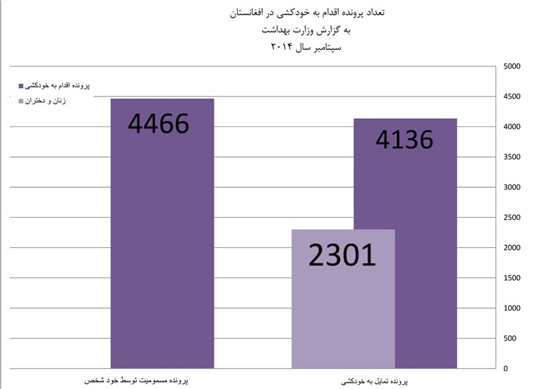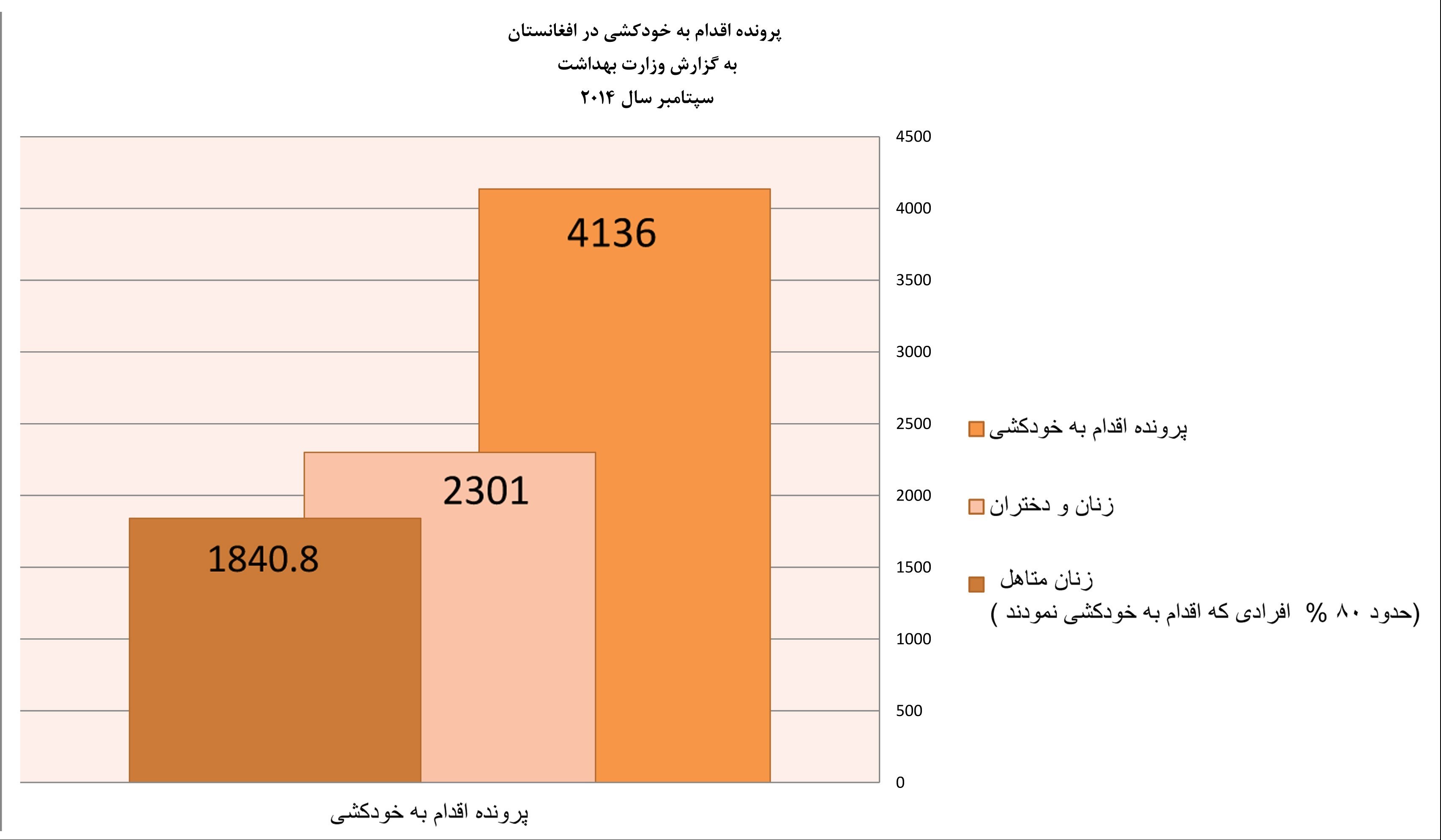 در گزارش دیگر آمده است که سالانه 2300 زن و دختر 15 تا 40ساله در افغانستان یعنی از هر 100هزار زن افغان 5 نفر خودکشی میکنند.