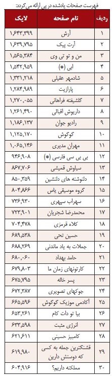 ــ محبوبترین صفحات فیس بوکی از لحاظ تعداد و لایک مربوط به صفحات خوانندگان و موسیقی میباشد.