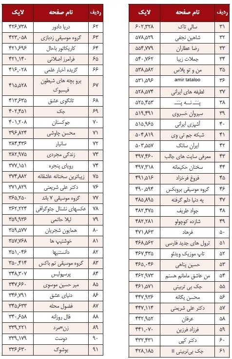 ــ میان یکصد صفحه محبوب فارسیزبان فیس بوک، صفحه «arash» با 1,643,399 لایک محبوبترین و صفحه «کلکل دخترها و پسرها» با 317,018 لایک در رتبه صدم بودهاند.