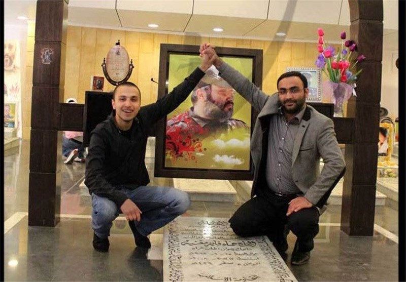 در تصاویر زیر، جهاد مغنیه، در کنار مزار پدرش، عکس هایی گرفته است که در آن ها، آقازاده های شهدای ایرانی، از جمله