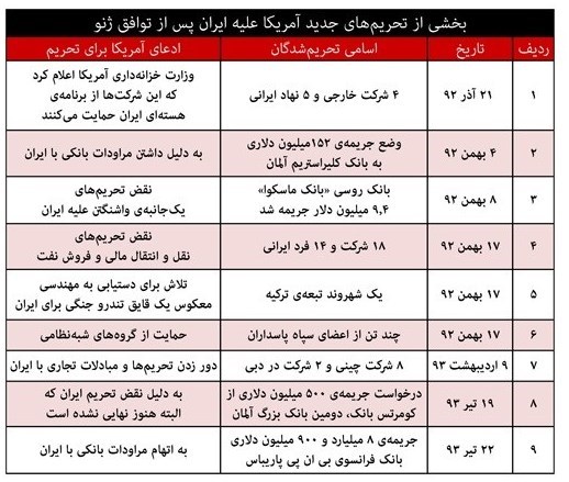 همچنین از سوی دیگر بنا به گزارشی که چندی پیش روزنامه خراسان منتشر کرد، طی حدود هشت ماه پس از توافق ژنو بیش از 55 مورد تحریم جدید از سوی آمریکا علیه شرکتها، بانکها و افراد با ادعای ارتباط با برنامه هستهای ایران یا مسائل حقوق بشر و تروریسم اعمال شده است. البته این تعداد شامل موارد جزئی نیست که قطعاً تعداد این تحریمها را افزایش خواهد داد. همچنین اتحادیه اروپا نیز 17 شرکت و فرد را در ارتباط با ایران تحریم کرد. این اتحادیه در تاریخ هشت آذر 92، «شرکت مدیریت ساخت نیروگاههای هستهای ایران» و 16 شرکت کشتیرانی را با ادعای حمایت از برنامه هستهای و دور زدن تحریمها، تحریم کرد.