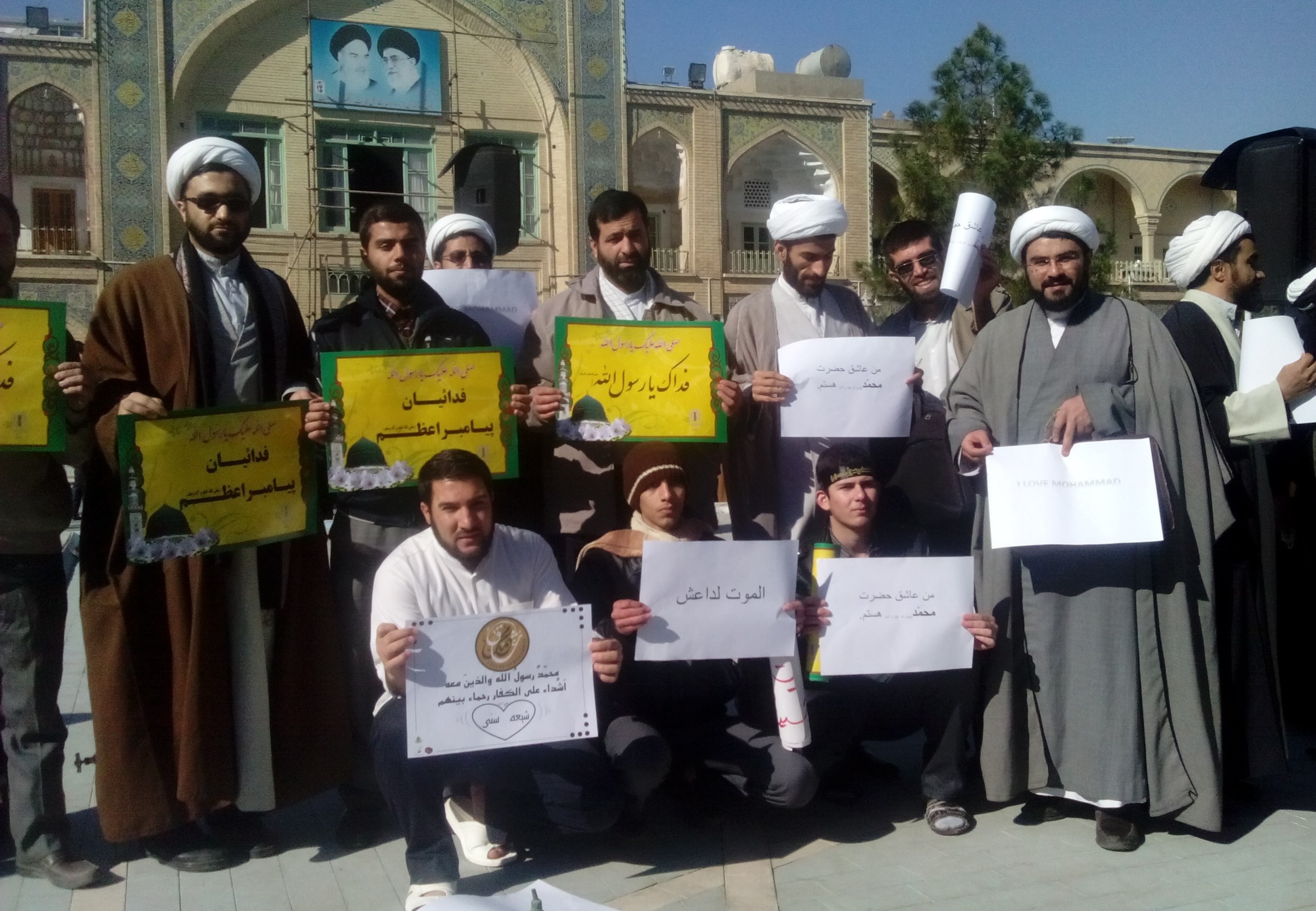 در این اجتماع پرشور طلاب شعارهایی نظیر «مرگ بر آمریکا»، «مرگ بر کاریکاتوریست مزدور»، «لبیک یا محمد (ص)»، «یا ایها المسلمون اتحدو اتحدو»، «فداک یا رسول الله»، «لبیک یا رسول الله»، «هتک حرمت مصطفی فریاد یا محمدا»، «مرگ بر داعش آمریکایی»، «راه امام خمینی (ره) پاینده باد رهبر ما خامنهای زنده باد»،«خامنهای خمینی دیگر است ولایتش ولایت حیدر است» را سر میدادند.