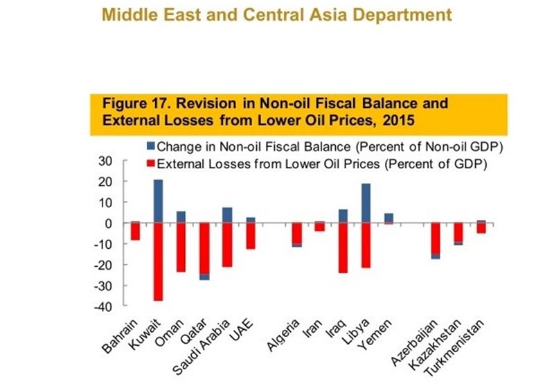 صندوق بین المللی پول همچنین پیش بینی کرده است زیان عمان از کاهش درآمد نفتی در سال 2015 معادل 21 درصد تولید ناخالص داخلی این کشور، امارات معادل 13 درصد، الجزایر معادل 11 درصد و بحرین معادل 9 درصد باشد.