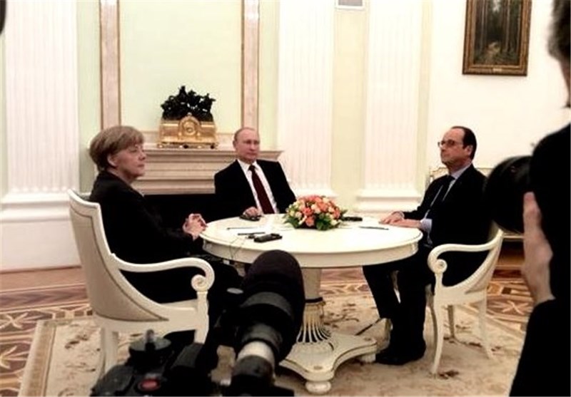 به گزارش گروه بینالملل خبرگزاری تسنیم، دفتر مطبوعاتی ریاست جمهوری روسیه اعلام کرد دیدار آنگلا مرکل صدر اعظم آلمان و فرانسوا اولاند رئیس جمهور فرانسه با ولادیمیر پوتین رئیس جمهور روسیه درباره بحران اوکراین آغاز شده است.