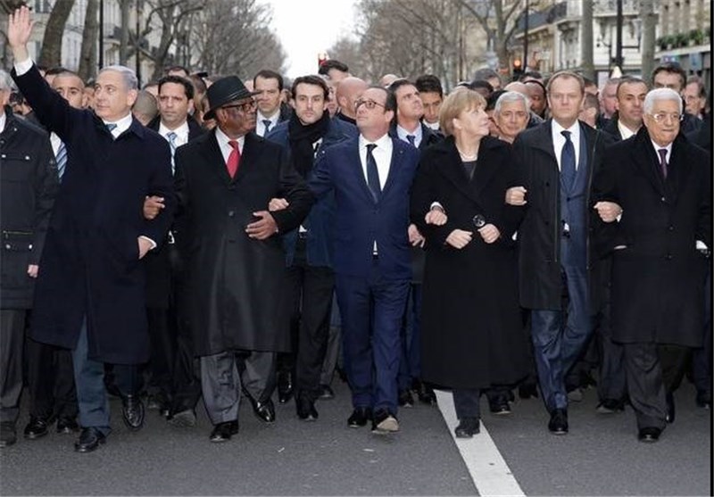 یکی از برجسته ترین حقایق در راهپیمایی که برگزار شد، این بود که بیشتر مسئولان عرب و خارجی که در صف اول این تظاهرات دیده میشدند، خود از بزرگترین سازندگان تروریسم حقیقی بودند. از بنیامین نتانیاهو نخستوزیر رژیم صهیونیستی که به تازگی 2200 انسان را در غزه قتلعام کرد و همچنان صد هزار نفر از خانواده این قربانیان امروز در معرض طوفان برفی کشنده قرار دارند گرفته تا احمد داوداوغلو که دولت وی به فراهم کردن گذرگاه امن و سریع، برای هزاران تکفیری عرب و مسلمانانی که امروز به دست داشتن در حمله پاریس متهم هستند و فرانسوا اولاند رئیسجمهور فرانسه و دوستان انگلیسی و آمریکایی وی که هواپیماهای با خلبان و بدون خلبان آنها در این لحظه در حال قتل عام مردم بیگناه در افغانستان، عراق، سوریه و یمن هستند.