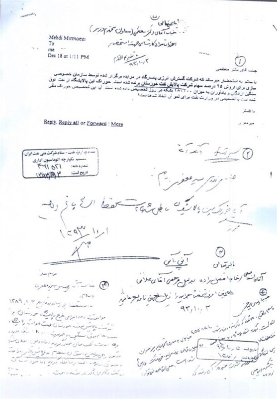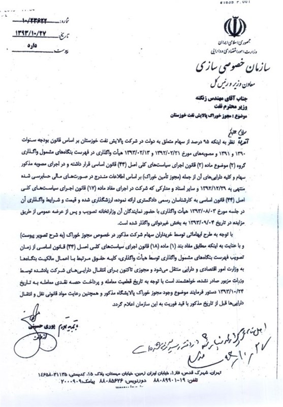 نامه سازمان خصوصی سازی به وزیر نفت که نشان میدهد 95 درصد از سهام شرکت نفت پالایش خوزستان دولتی است در ذیل میآید: