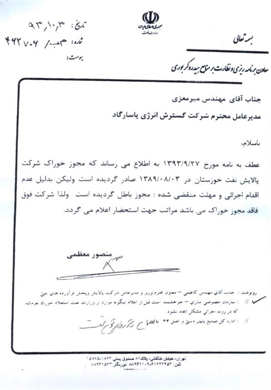 نامه شرکت گسترش انرژی پاسارگاد به منصور معظمی؛ معاون برنامهریزی و نظارت بر منابع هیدروکربوری وزارت نفت مبنی بر برنده شدن در مناقصه خرید پالایشگاه خوزستان و درخواست برای اطلاع از معتیربودن مجوز تأمین خوراک آن: