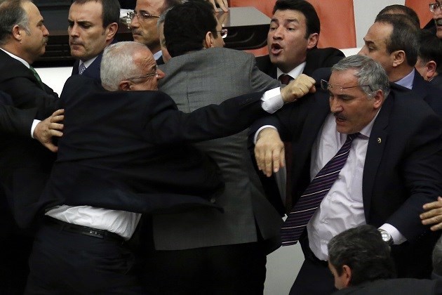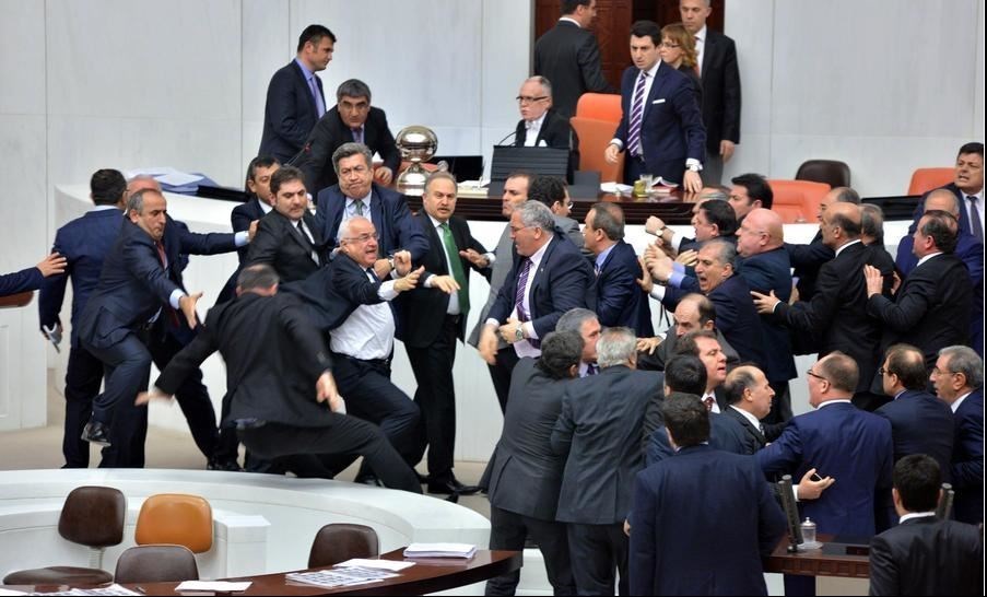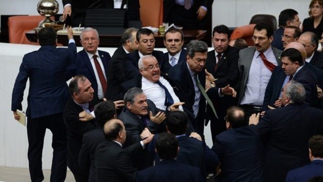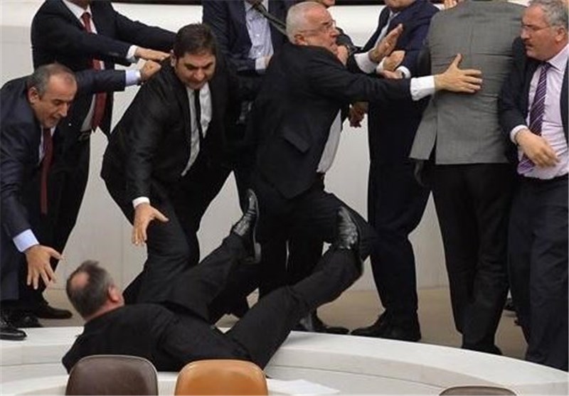به گزارش گروه بینالملل خبرگزاری تسنیم به نقل از خبرگزاری دوغان، پارلمان ترکیه بار دیگر صحنه یک هرج و مرج شدید جدید شد و نمایندگان مخالف و موافق قانونی که اختیارات پلیس برای برخورد با معترضین را افزایش خواهد داد، با مشت به جان یکدیگر افتادند.