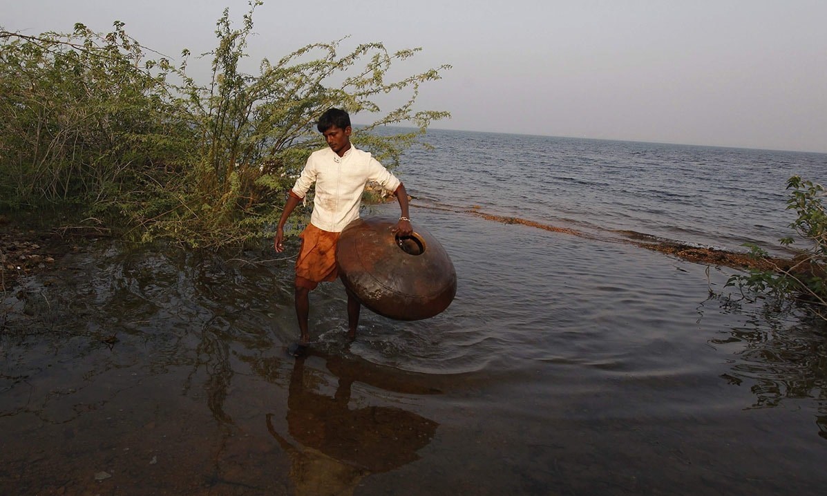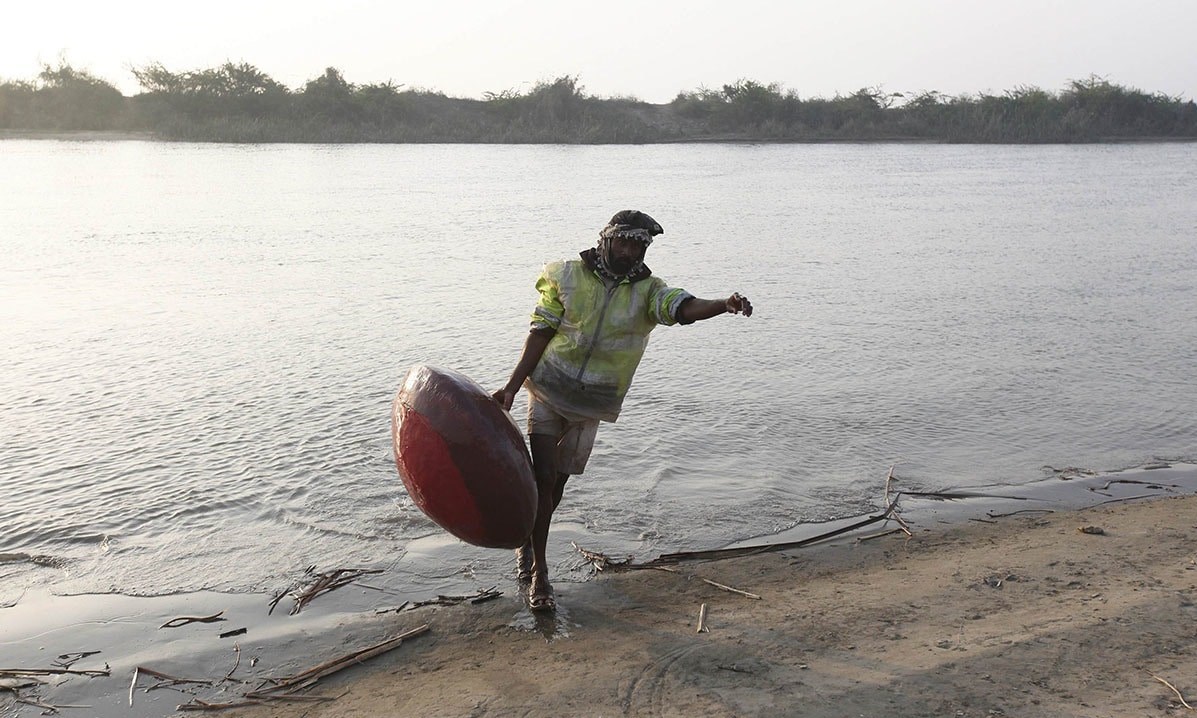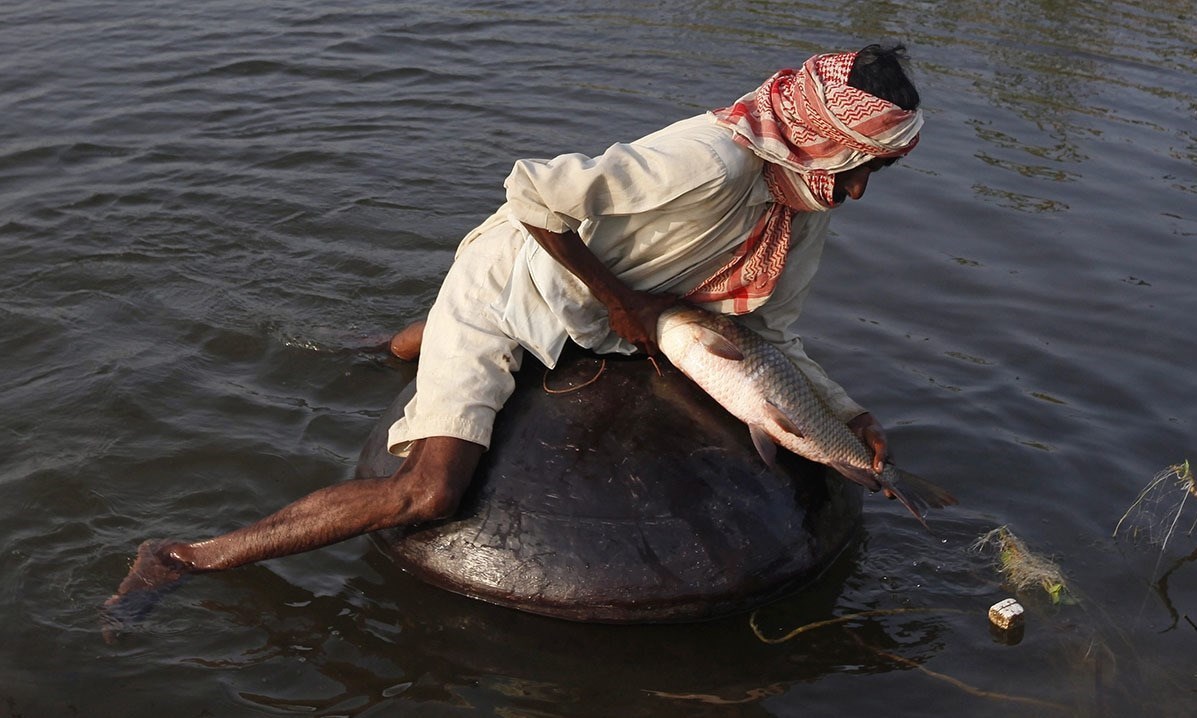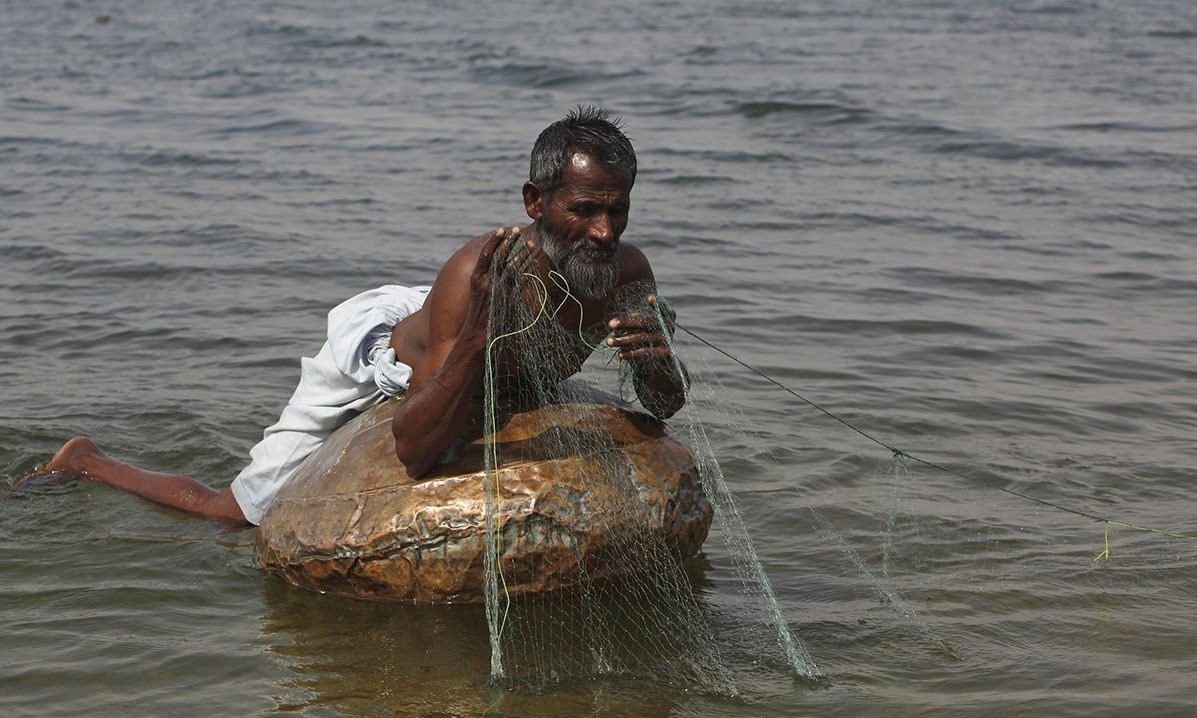 مردم روستای سونیری ایالت سند روی کوزهها می شینند و با بهره برداری از تور ماهیگیری میکنند.
