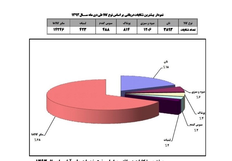 قابل ذکر است، از مجموع شکایت دریافتی تعداد21070 فقره(85 درصد) مروط به بخش کالا و تعداد 3623 فقره(15 درصد) مربوط به بخش خدمات میباشد. بطوریکه در بخش کالا: بیشترین شکایت از نان، میوه و سبزی، پوشاک، سبوس گندم و لبنیات بوده و در بخش خدمات: بیشترین شکایت از تعمیر خودروهای سبک، حمل و نقل درون شهری، مشاورین املاک تعویض روغنی و آرایشگاه مردانه میباشد.