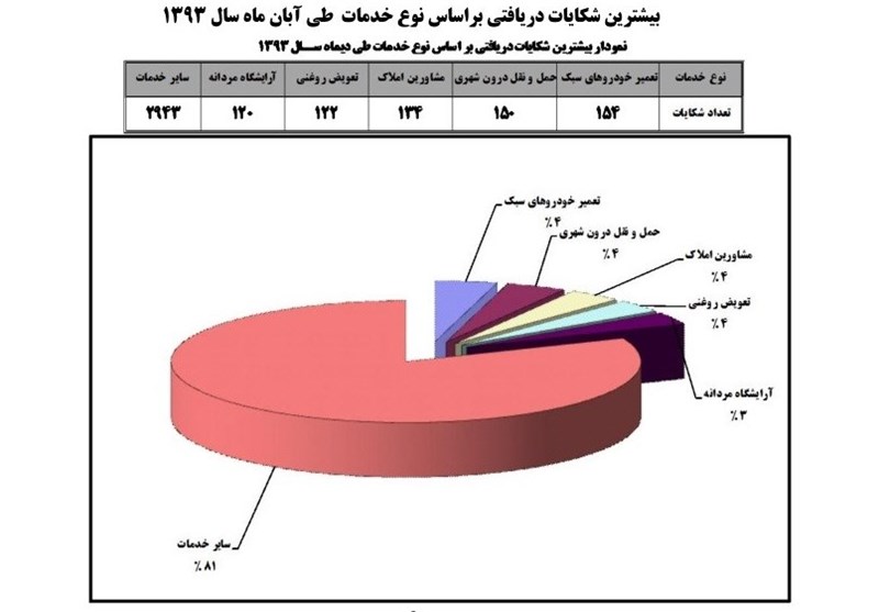 خبرگزاری تسنیم جداول و نمودارهای شکایات مردمی در دیماه امسال را به شرح زیر منتشر می کند: