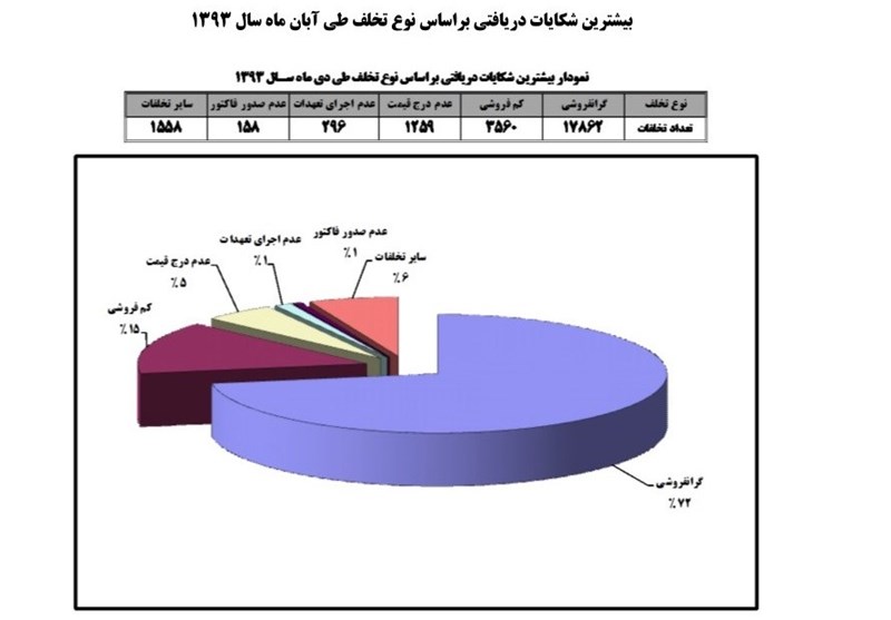 بررسی شکایات دریافتی بر اساس نوع تخلف، بیانگر این است که گرانفروشی، کم فروشی و عدم درج قیمت بیشترین تخلفات را به خود اختصاص داده اند.