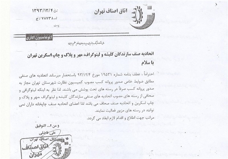 در متن این جوابیه که به امضای علی فاضلی رئیس اتاق اصناف ایران رسیده است، آمده: «اتحادیه های صنفی مطابق ضوابط خاص صدور پروانه کسب مصوب کمیسیون نظارت شهرستان تهران، مجاز به صدور پروانه کسب صرفا در رسته های تحت پوشش هستند. لذا نظر به اینکه لیتوگرافی و صحافی از رسته های مصوب اتحادیه های صنفی سازندگان کلیشه، لیتوگراف، مهر، پلاک، چاپ اسکرین و اتحادیه صنف صحاف است. لذا اعضای اتحادیه صنف چاپخانه داران نمی توانند در رسته های مزبور فعالیت کنند.»