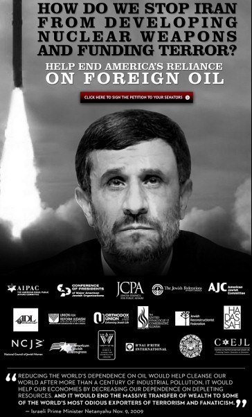 شما سالها پیش از این شاهد تبلیغی در نیویورک تایمز بودید که در آن تیتری استفاده شده بود که «چگونه ساختن سلاح هستهای و ترور توسط ایران را متوقف کنیم؟» در این تصویر احمدینژاد به شکلی ترسناک نشان داده شده است. همانطوری که شاهد هستید به شکل عادی صهیونیست پشت سر تمام این ماجرا و پشت صحنه آن بازی میکنند. در این مورد هم شاهد هستید این گروههای صهیونیستی مانند آیپک و ... این کار تبلیغی را نیز امضا کردهاند تا که مردم آمریکا نفت کشورهایی مانند ایران را مصرف نکنند که ایران در این مسیر بایستد و پیشرفت نداشته باشد.