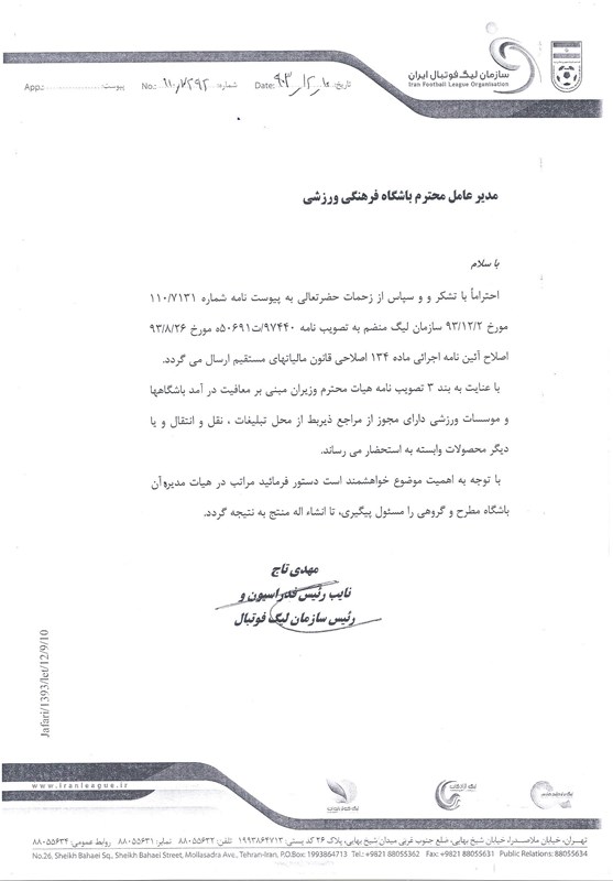 با توجه به اهمیت موضوع خواهشمند است دستور فرمایید مراتب در هیئت مدیره آن باشگاه مطرح و گروهی را مسئول پیگیری، تا انشاالله منتج به نتیجه گردد.»