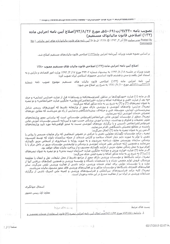 احتراماً با تشکر و سپاس از زحمات حضرتعالی به پیوست نامه شماره 110/7131 مورخ 93/12/2 سازمان لیگ منضم به تصویب نامه 97440/ت 50691ه مورخ 93/8/26 اصلح آئیننامه اجرائی ماده 134 اصلاحی قانون مالیاتهای مستقیم ارسال میگردد.