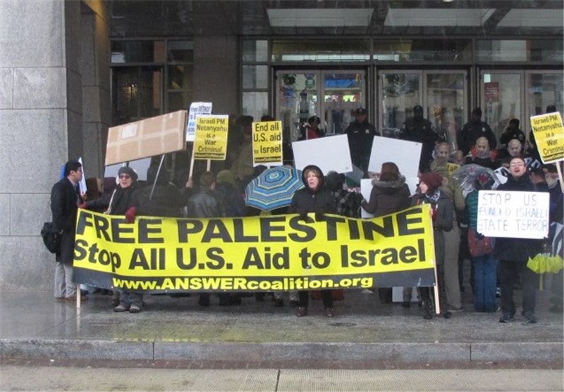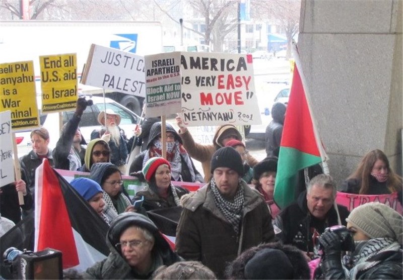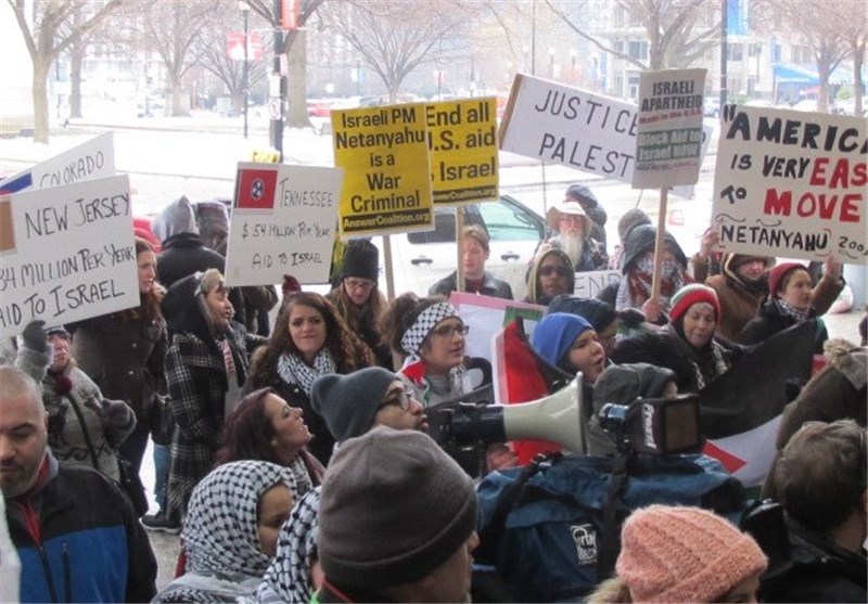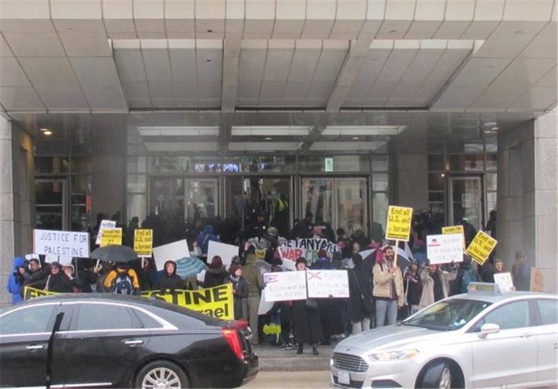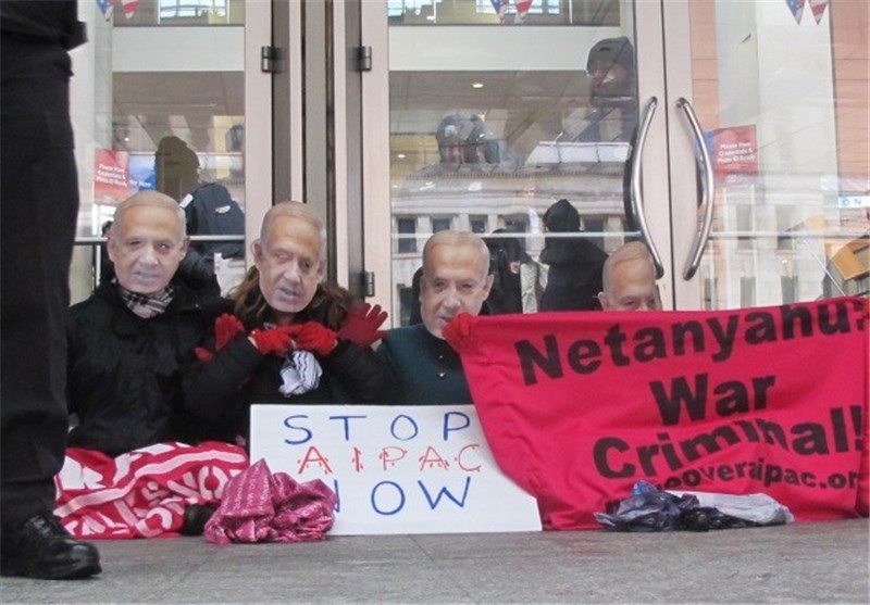 به گزارش خبرنگار تسنیم مستقر در آمریکا، ده‌ها نفر از مردم آمریکا همزمان با سفر نتانیاهو به آمریکا و سخنرانی وی در آیپک و کنگره مقابل محل نشست سالیانه آیپک تجمع کردند و نتانیاهو را جنایتکار جنگی خواندند.