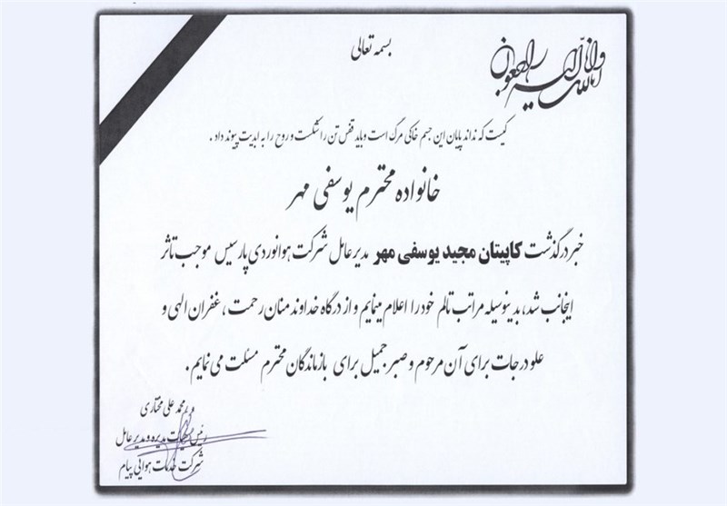 "خبر درگذشت کاپیتان مجید یوسفیمهر مدیرعامل شرکت هوانوردی پارسیس موجب تأثر اینجانب شد، بدینوسیله مراتب تألم خود را اعلام مینمایم و از درگاه خداوند منان رحمت، غفران الهی و علوّ درجات برای آن مرحوم و صبر جمیل برای بازماندگان محترم مسئلت مینمایم.