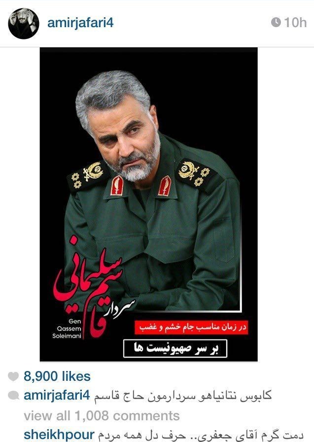 به گزارش گروه "رسانهها" خبرگزاری تسنیم، امیر جعفری، بازیگر سینما در صفحه اینستاگرام خود در قبال مواضع نتانیاهو، رئیس رژیم صهیونیستی درباره کشورمان، عکسی از سردار سلیمانی را منتشر کرد و نوشت: "کابوس نتانیاهو سردارمون حاج قاسم"