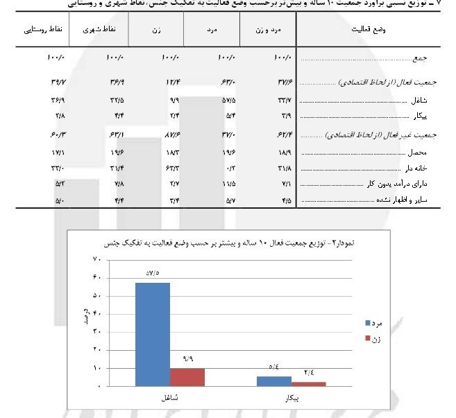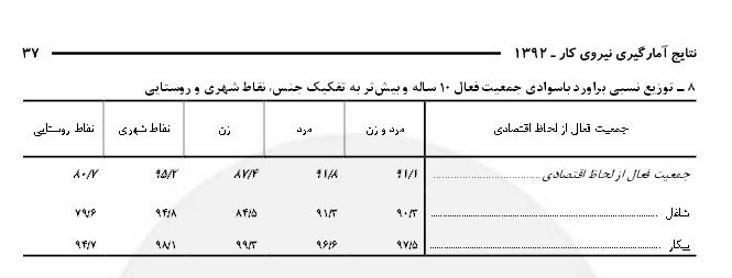 مطابق گزارش مرکز آمار در سال 1392, افراد شاغل و بیکار در مجموع ,37.6درصد از جمعیت 10ساله و بیش تر را تشکیل میدادهاند. این نسبت در جامعه مزبور برای مردان 63.0درصد و برای زنان 12.4 درصد بوده است. همچنین این نسبت در نقاط شهری 36.9درصد و در نقاط روستایی 39.7درصد است.