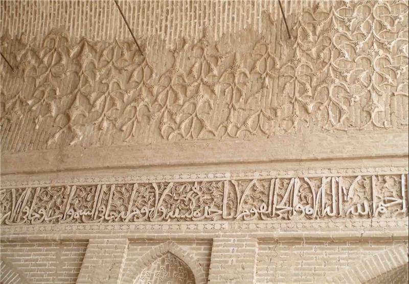 محمد رضا صدوقی افزود: نقشها زمینه اصلی کارند و کتیبه های درون نقشها با خط کوفی و نسخ خوشنویسی شدهاند و متن کتیبهها آیات قرآن است و ابعاد، شکل ستونها و نوع آجرها بر تقدم احداث جبهه جنوبی مسجد بر دیگر قسمتها دلالت دارد که نخستین ایوان ساخته شده مسجد در دوره سلجوقیان بوده است.