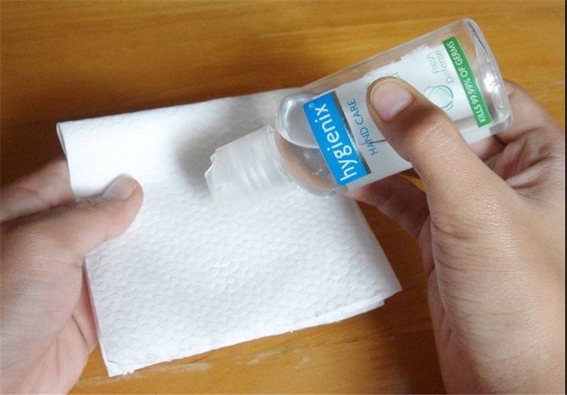 2. دستمال کاغذی تمیزی را بردارید و مقداری ژل الکل روی آن بریزید.