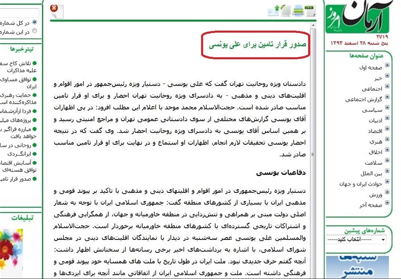 اما روز گذشته دادستان ویژه روحانیت تهران رسماً احضار علی یونسی به دادگاه ویژه روحانی را تأیید و گزارش روزنامه آرمان و اظهارات مسئول روابط عمومی و ارتباطات دفتر دستیار ویژه رئیس جمهور در امور اقوام و اقلیتهای دینی و مذهبی را تکذیب کرد.