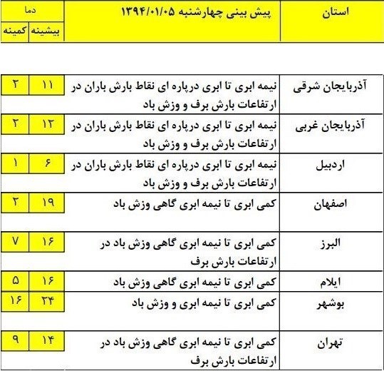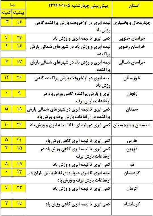 براساس این گزارش در روز جمعه این سامانه فعالیت خود را روی برخی از مناطق مرکزی، دامنههای مرکزی البرز، سواحل جنوبی دریای خزر، جنوب و بهتدریج نوار شرقی کشور خواهد داشت و بعد از ظهر شنبه از مناطق شرقی و جنوب شرقی خارج میشود.
