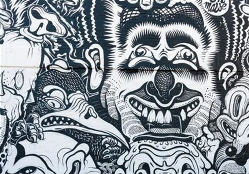 زنی از کنار نقاشی دیواری عجیب و غریب در شرق لندن عبور میکند. (REUTERS)