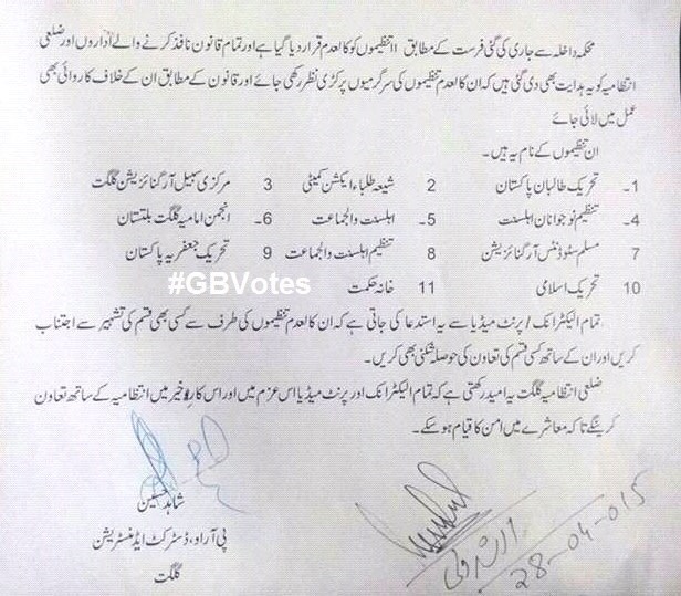وزارت امور داخلی ایالت گلگت بلتستان در این خصوص هشدار داده که احزاب و گروههای ممنوع الفعالیت ذکر شده در این نامه حق تبلیغات برای شرکت در انتخابات را ندارند و مقامات دولتی این ایالت نیز دستور دارند تا هیچگونه همکاری با این احزاب و گروهها صورت نگیرد.