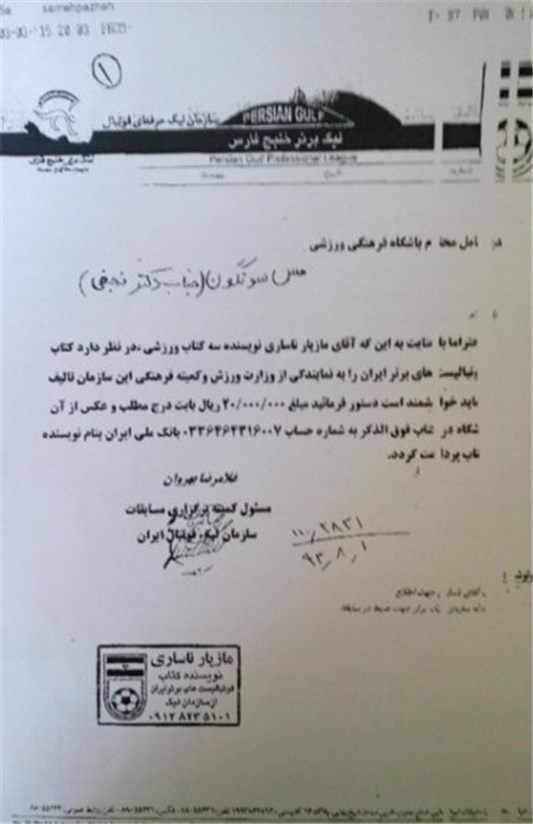 1ـ سازمان لیگ فوتبال ایران در نامهای که شماره فاکس سازمان لیگ که در بالای سند قابل مشاهده است، در تاریخ 91/08/01 به شماره 283/11 با امضای غلامرضا بهروان سرپرست سازمان لیگ، به صورت رسمی مازیار ناساری را به عنوان نویسنده کتاب فوتبالیستهای برتر ایران معرفی میکند و از باشگاه مس تقاضای نهایت مساعدت با وی را میکند. (سند شماره 1)