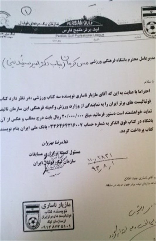 4ـ در نامهای که بازهم با سربرگ سازمان لیگ و به امضای غلامرضا بهروان در تاریخ 93/08/01 به باشگاه مس سنگون ارسال شده است، بازهم با معرفی رسمی مازیار ناساری به این باشگاه، شماره حساب و مبلغ مد نظر برای کمک به وی جهت چاپ کتاب اعلام میشود. محتوای نامه کاملا مشخص میکند که این نامه به باشگاههای مختلف کشور ارسال شده است (نام باشگاهها با خودکار در نامه درج شده است) و باشگاه مس سنگون این نامه را در اختیار باشگاه مس کرمان قرار داد. به دلیل همخانواده بودن باشگاههای مس در ایران با یکدیگر این اسناد در اختیار باشگاه مس کرمان قرار گرفته است و قطعا این مکاتبات با سایر باشگاههای کشور نیز انجام گرفته است (سند شماره4)