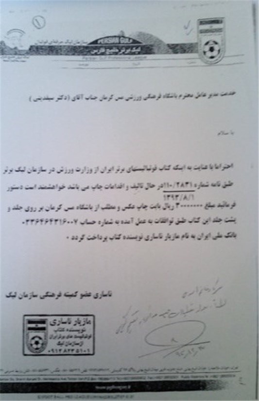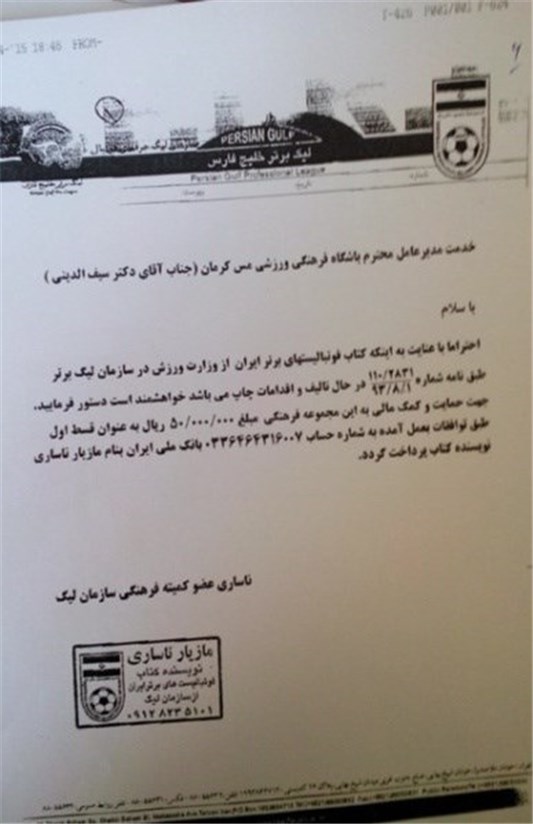 5ـ در تاریخ 93/08/01 مجددا نامهای از طرف سازمان لیگ با امضای مسئول برگزاری مسابقات این سازمان، مجددا به باشگاه مس ارسال میگردد که مبلغ مد نظر و شماره حساب برروی آن درج شده است و پول واریزی باشگاه مس کرمان نیز کاملا بر اساس این نامه انجام گرفته است.(سند شمارهی 5)