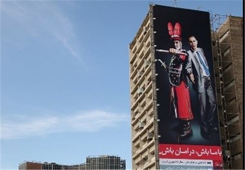 این تابلو چندی پیش توسط خانه طراحان انقلاب اسلامی طراحی شده و به نشانه اعتراض به آمریکا در نزدیکی میدان ولیعصر تهران نصب شده بود. گفتنی است پیش از این در همین راستا تبلیغاتی با عنوان صداقت آمریکایی نیز در اعتراض به مشی آمریکا در مذاکرات هسته ای در جای جای تهران نصب شده بود که البته پس از مدتی با اعتراض برخی حامیان دولت، توسط شهرداری جمع آوری گردید.