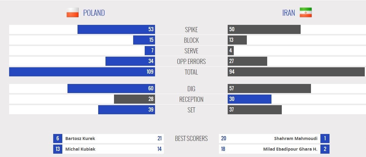 در این مسابقه همچنین تیم ایران 27 امتیاز از اشتباهات تیم ملی لهستان به دست آورد و در مقابل 34 امتیاز نیز از اشتباهات خود به حریف تقدیم کرد.