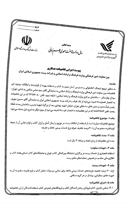 این سخنان حسینپور در شرایطی است که مدت اجرایی بودن تفاهمنامه از زمان امضا و مبادله 3 سال تعیین شده است، بنابراین انتظار میرود، مسئولان وزارت ارشاد هر چه سریعتر نسبت به اجرایی شدن این تفاهمنامه اقدام کنند تا ناشران بتوانند خدمات بیشتر و بهتری را زا تسهیلات پست دریافت کنند.