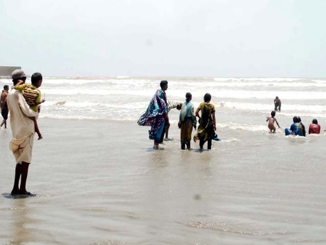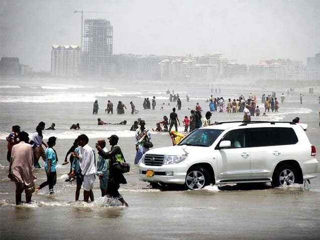 مردم کراچی با وجود هشدار مقامات دولتی، در کنار دریا حضور دارند و از هوای خنک در تابستان لذت میبرند.