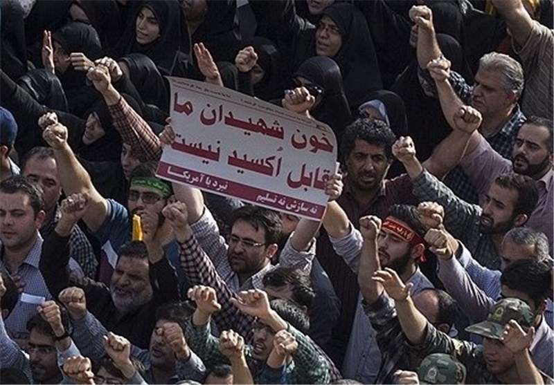 پلاکاردهای در دستان مردم امروز تنها یک پیام برای مسئولان و تیم مذاکره کننده هسته ای کشورمان داشت، «مقاومت در برابر دشمنان»؛ پیامی که مخابره آن به داخل و خارج نه به وسیله پلاکارد و دست نوشته که از شعارهای «هیهات من الذله» کاملا مشخص بود.