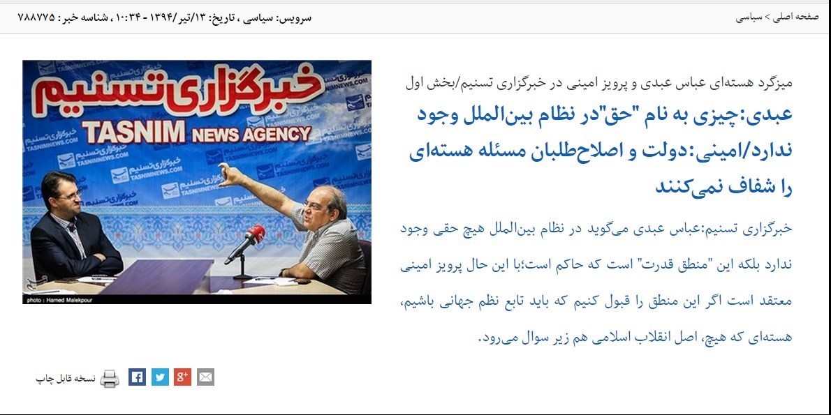 عباس عبدی در پاسخ به تسنیم با بیان "بهنظر من مسئله در هر دو صورت تا حدی طرح شده است، اما اولین سؤال این است که چهکسی مانع طرح همهجانبه این موضوع در جامعه است؟ چرا این موضوع بهطور دقیق مطرح نمیشود تا همه در خصوص آن اظهار نظر کنند؟ چرا فقط یک طرف قضیه بحث شود و دیگر ابعاد پرونده هستهای پنهان بماند را بررسی نمیکنیم؟" خاطرنشان کرد: من فکر نمیکنم دولت مانع این کار باشد، بهنظر من دولت در رسانهها نفوذ چندانی ندارد، دولت تنها یک رسانه دارد، و به رسانههای مهمی مثل رادیو و تلویزیون دسترسی ندارد.