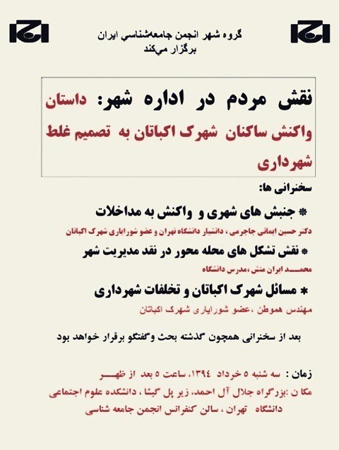 بنا بر گزارشهای دریافتی ساکنان اکباتان برای برگزاری تجمع اعتراضی علیه ساخت یک مرکز جاسوسی و سرکوب در این منطقه فراخوان دادند. این مرکز تحت عنوان دجالگرانه «دارالقرآن» تأسیس شده است. تجمع اعتراضی در ساعت 18 عصر سهشنبه 22اردیبهشت 94 برگزار میشود.(سایت خبری منافقین)
