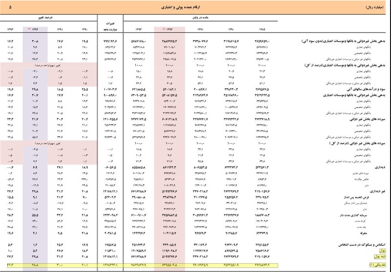 بانک مرکزی البته در توضیحاتی تأکید کرده است که در سال 92 آمار شش بانک ایران‌زمین، قرض الحسنه رسالت، خاورمیانه، بین المللی کیش، ایران و ونزوئلا و قوامین و چهار مؤسسه اعتباری صالحین، پیشگامان آتی،‌ کوثر و عسکریه به آمارهای پولی و بانکی کشور اضافه شده است. ضمناً اطلاعات بانک قرض الحسنه مهر از اسفند 92 به بعد از شمول بانک‌های تخصصی خارج و به طبقه بانک‌های غیردولتی اضافه شده است.