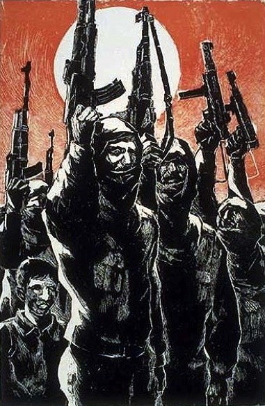 برخلاف اثر پیشین این بار شخصیت مبارز پوستر مردان چفیه‌پوش‌اند که تفنگ‌های خود را رو به آسمان افراشته‌اند. البته یک کودک در گوشه سمت چپ تصویر نیز دیده می‌شود که در کنار تفنگ‌های افراشته، موتیف‌های تکراری رضوان به حساب می‌آیند. در این تصویر که نسبت اثر سابق رو به انتزاع رفته است، زیتون جای خود را به خورشیدی در پس‌زمینه سرخ داده است که علاوه بر ارج یافتن امر قدسی، تغییر فاز رنگی به قرمز، از شدت گرفتن عنصر مقاومت حکایت می‌کند. حتی فرم خطی رو به بالا به فرم مدوری تبدیل شده است که با کمک خطوط حواشی خورشید ساختار یافته می‌شوند.
