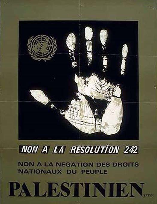 «قطعنامه» از دو جز بصری و نوشتاری تشکیل شده است. نوشتار به زبان فرانسوی است که ترجمه آن عبارت از است «نه به قطعنامه 242، نه به نفی حقوق، مردم ملی فلسطین». اثر اشاره مستقیمی به قطعنامه 242 مصوب 22 نوامبر 1067 دارد که بدون ضمانت اجرایی مناسب از اسراییل می‌خواهد سرزمین‌های اشغالی 1967 را ترک کند و مساله آوارگان را عادلانه حل کند. این در حالی است که مبارز فلسطینی تمامیت ارضی فلسطین را می‌طلبد. دست که نماد ثابت هنرمندان فلسطینی است به نماد اعتراض گشاده و بزرگ در برابر نشان سازمان ملل کوچک و حقیر، دلالت بر روحیه مبارزه‌جویانه فلسطینیان دارد. نمادی که ردپای آن را می‌توان در انقلاب 57 ایران نیز یافت.