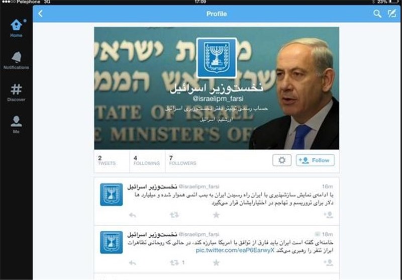 به گزارش گروه بین‌الملل خبرگزاری تسنیم، بنیامین نتانیاهو، نخست‌وزیر رژیم صهیونیستی به منظور آخرین تلاش‌ها برای سنگ‌اندازی در مسیر مذاکرات هسته‌ای اقدام به راه‌اندازی حساب توییتری فارسی زبان کرد. این حساب درحالی ساعاتی پیش راه‌اندازی شد که در همین ساعات ابتدایی واکنش منفی بسیاری از مردم را به همراه داشته است.