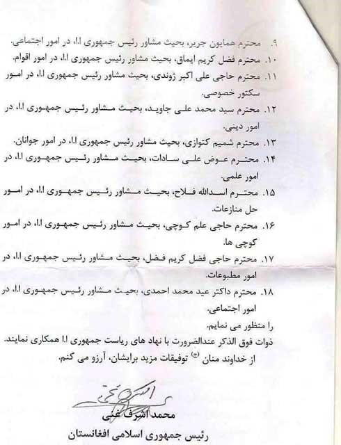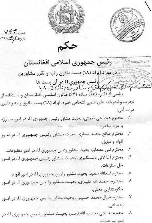 فهرست مشاوران منصوب شده از سوی اشرفغنی را در ادامه مشاهده میکنید: