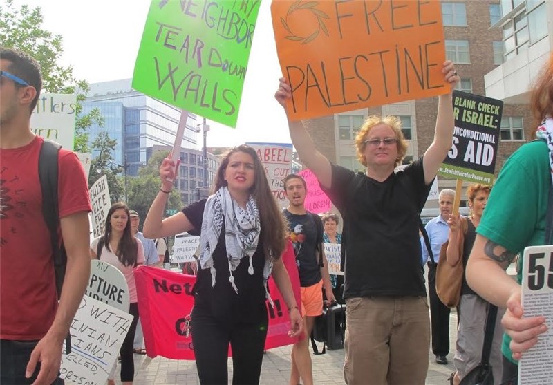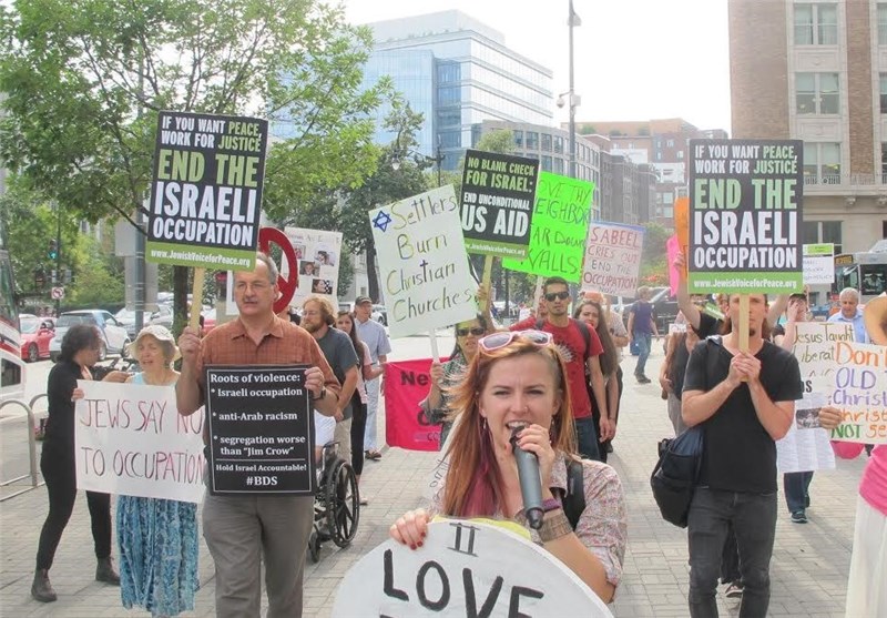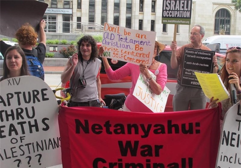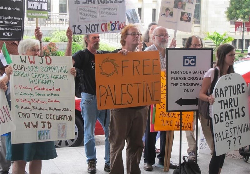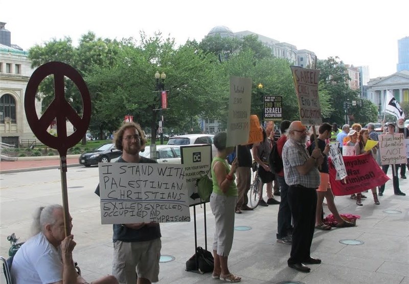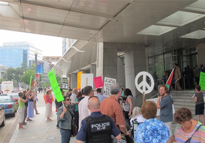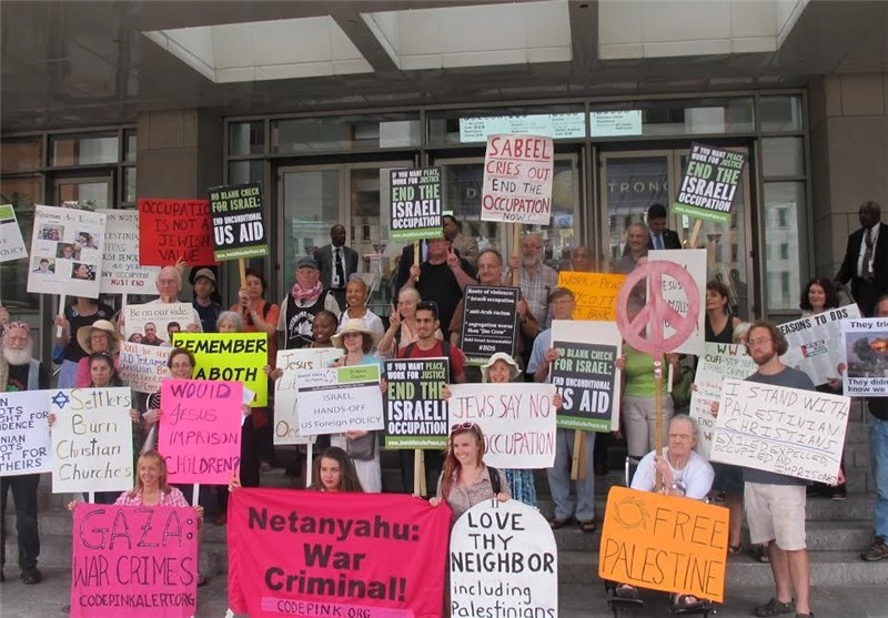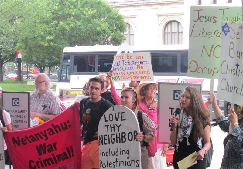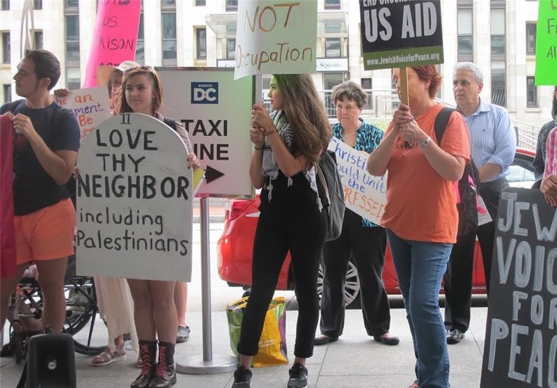 به گزارش خبرنگار خبرگزاری تسنیم در واشنگتن، روز دوشنبه فعالان صلحطلب آمریکایی در اعتراض به نشست گروه جنگطلب «مسیحیان متحد هوادار اسرائیل» در واشنگتن تجمعی اعتراضی را برگزار کردند. معترضان صلحطلب در این حرکت اعتراضی شعارهایی همچون «نه به جنگ با ایران» و «میلیونها دلار برای آغاز جنگ با ایران هزینه شده، اما آمریکاییها از جنگ خستهاند» سر دادند.