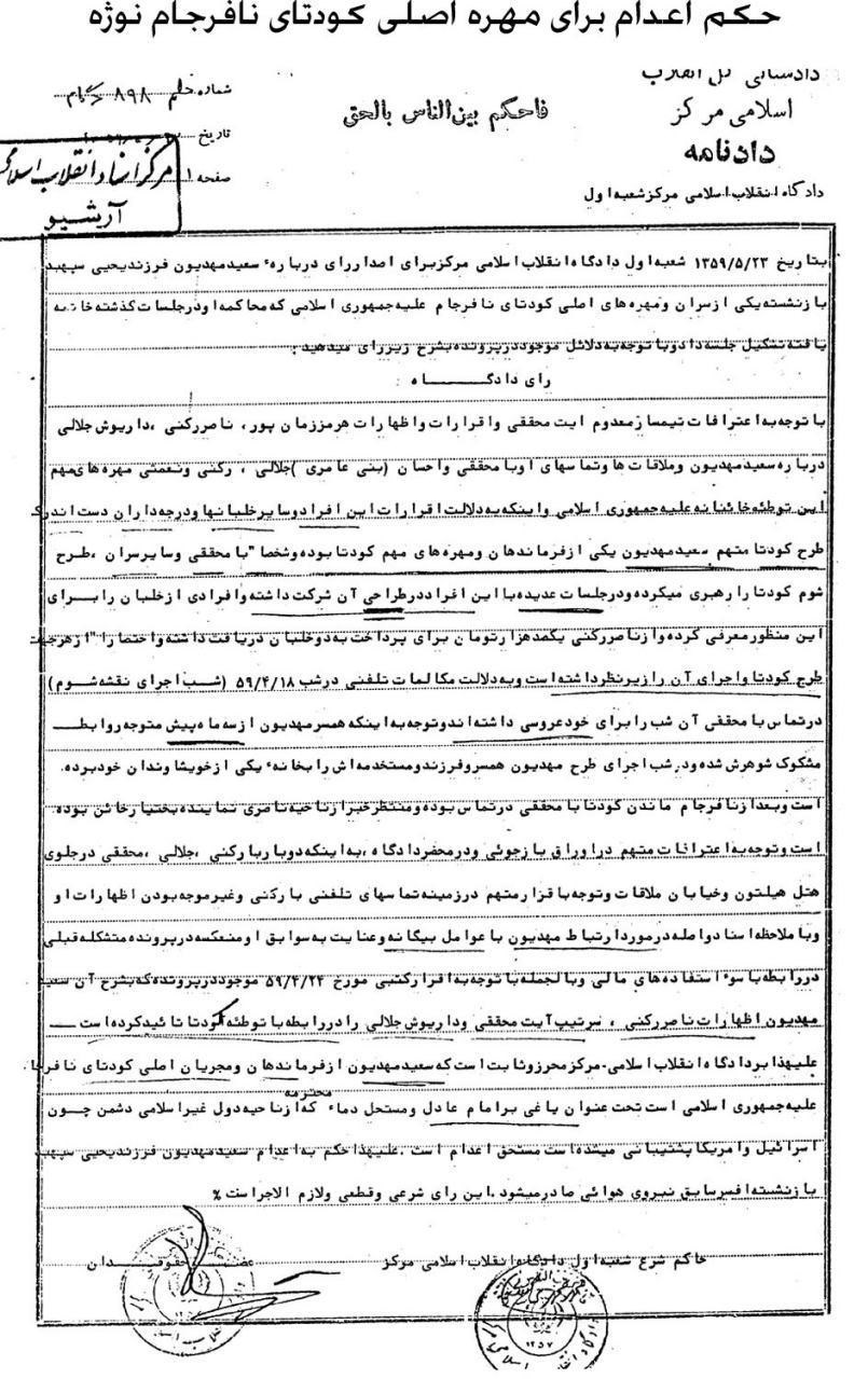 به گزارش گروه "رسانهها" خبرگزاری تسنیم، در سالگرد کودتای نافرجام نوژه، مرکز اسناد انقلاب اسلامی برای نخستین بار تصویر حکم اعدام سعید مهدیون فرمانده اصلی کودتا نوژه توسط دادگاه انقلاب صادر شده بود را در شبکه اجتماعی تلگرام، مختص گروه رسانهای "خبرچین" منتشر کرد.