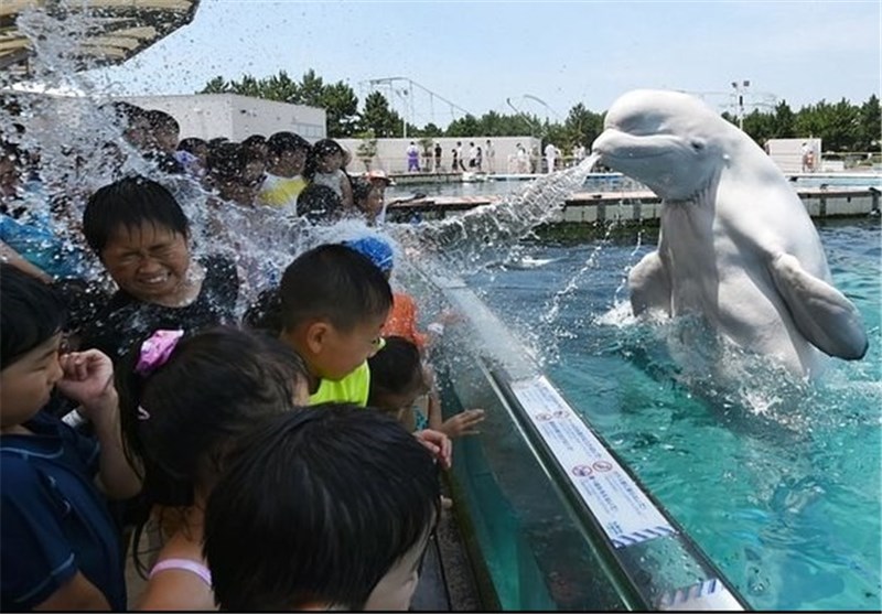 آب پاشیدن یک دلفین به بازدیدکنندگان آکواریوم در «یوکوهاما» ژاپن (Getty)