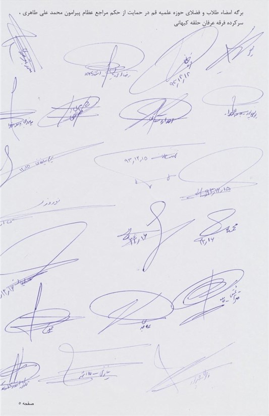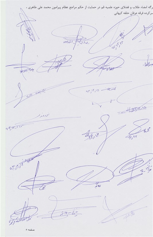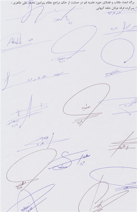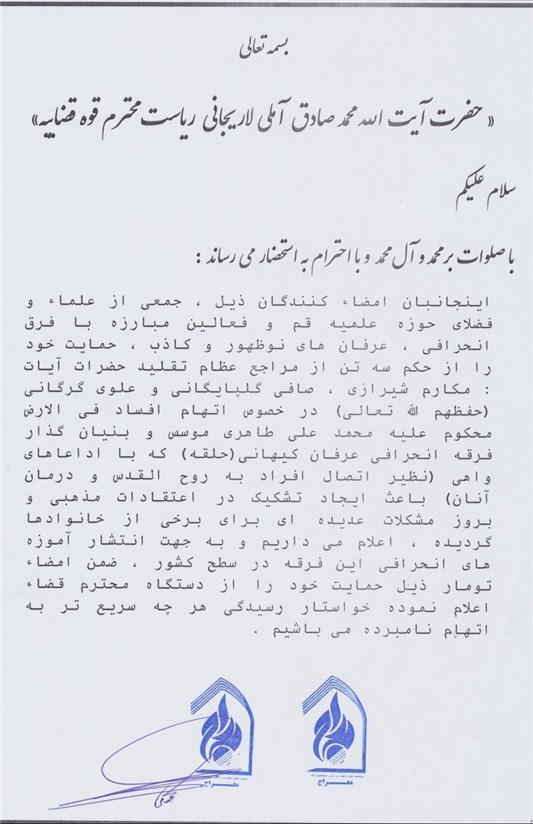 با احترام به استحضار میرساند اینجانبان امضاکنندگان ذیل جمعی از علما و فضلای حوزه علمیه قم و فعالین مبارزه با فِرَق انحرافی، عرفانهای نوظهور و کاذب حمایت خود را از حکم سه تن از مراجع عظام تقلید حضرات آیات مکارم شیرازی، صافی گلپایگانی و علوی گرگانی (حفظالله تعالی) در خصوص اتهام افساد فی الارض محکوم علیه محمدعلی طاهری موسس و بنیانگذار فرقه انحرافی عرفان کیهانی (حلقه) که با ادعاهای واهی (نظیر اتصال افراد به روحالقدس و درمان آنان) باعث ایجاد تشکیک در اعتقادات مذهبی و بروز مشکلات عدیده برای برخی از خانوادهها شده، اعلام میداریم و به جهت انتشار آموزههای انحرافی این فرقه در سطح کشور ضمن امضای طومار ذیل حمایت خود را از دستگاه قضا اعلام نموده و خواستار رسیدگی هر چه سریعتر به اتهام نامبرده میباشیم.